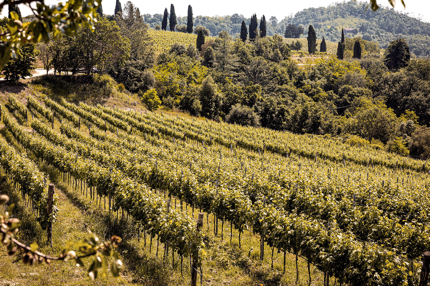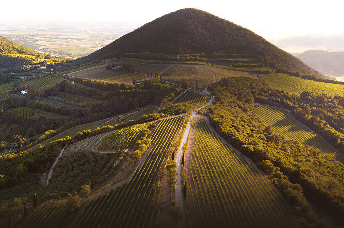 Dall’alto dei Colli Euganei la vista spazia sulle vigne ed uliveti circostanti.
